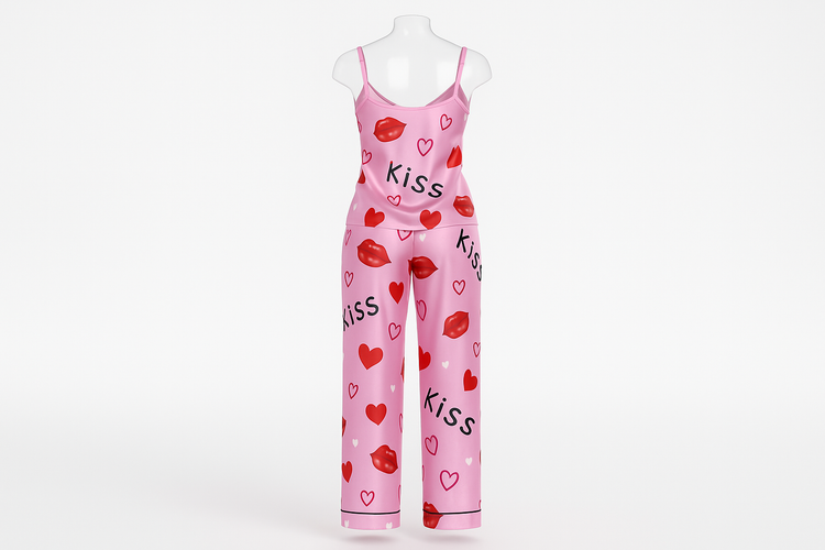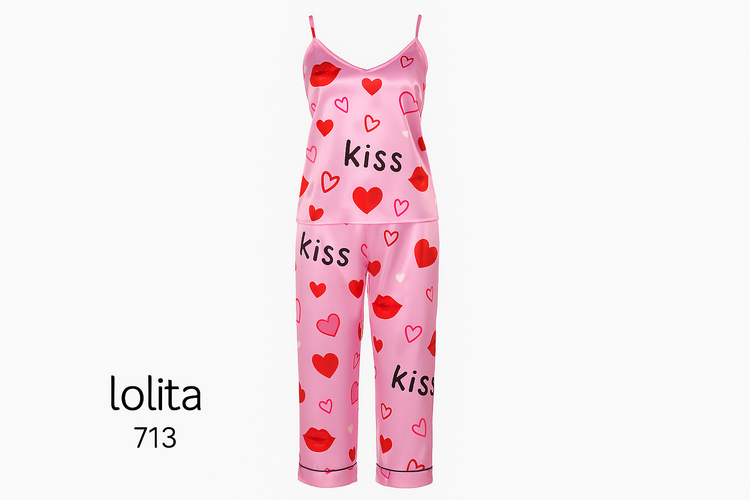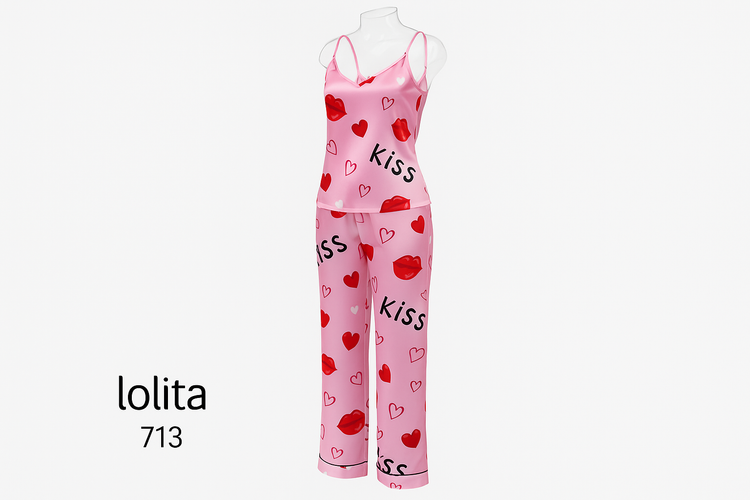 لباس خواب ساتن صورتی طرح بوسه و قلب (Lolita 713)
