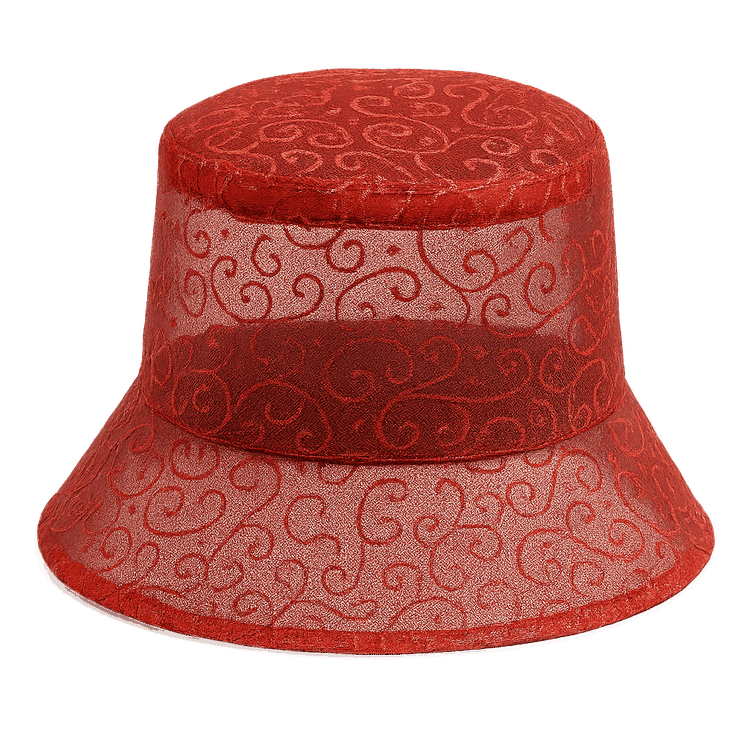 جنس: لایه بیرونی از پارچه مش توری (Mesh) قرمز با طرح گلبرگ و اسکرول برجسته، لایه داخلی پارچه مات همرنگ برای استحکام