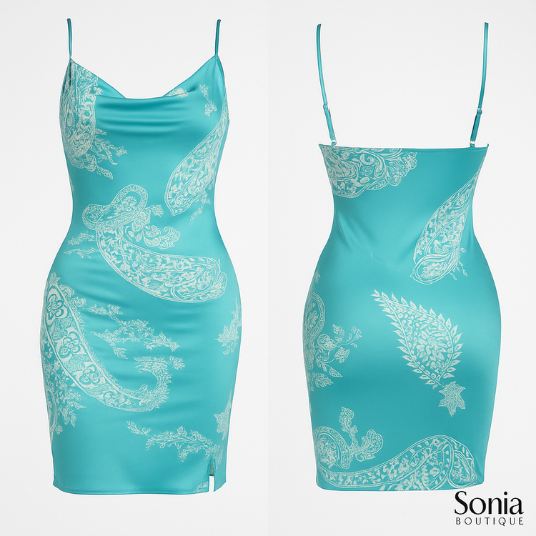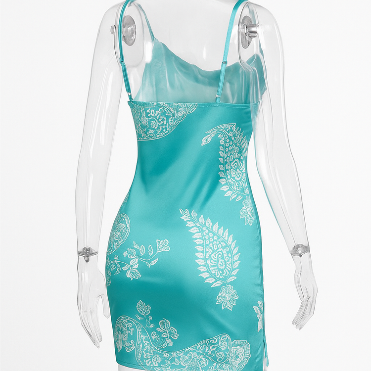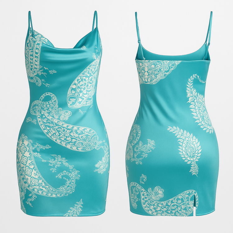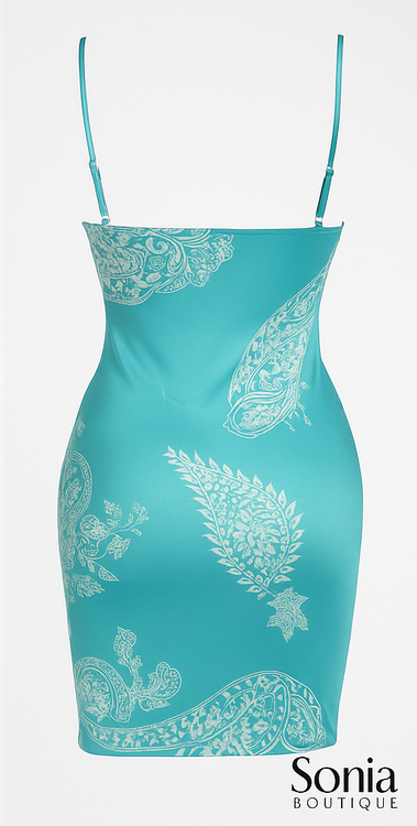 چاپ نقش سفید ظریف روی زمینه فیروزهای براق .... قسمت پشت با برش ساده و بندهای قابل تنظیم