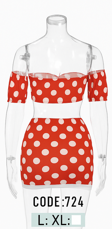 طرح ورنگ: طرح خالخالی سفید روی زمینه قرمز با ترکیب رنگ مشکی و سفید در بخش دامن