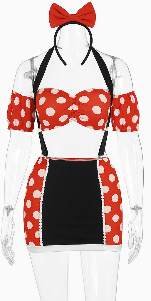 نوع محصولست لباس فانتزی دوتکه (کرپ تاپ + دامن کوتاه)جنسترکیب پلیاستر و اسپاندکس با کشسانی مناسبطرح ورنگطرح خالخالی سفید روی زمینه قرمز با ترکیب رنگ مشکی و سفید در بخش دامنیقه و آستینیقه دلبری، آستینهای جداشونده کوتاه با کش مچیبند هابند مشکی گردنی برای فیکس بهتر کرپ تاپجزئیات تزیینیهدبند پاپیون قرمز بزرگ جهت تکمیل استایلمناسبتاستفاده در مهمانیهای خصوصی، عکاسی و اجراهای نمایشیسایزفری سایز 38 تا 44