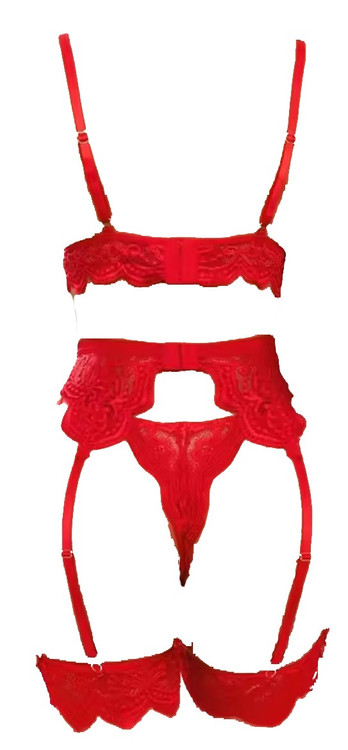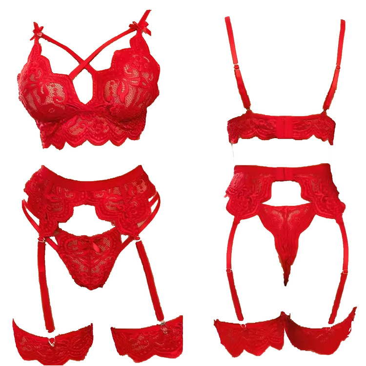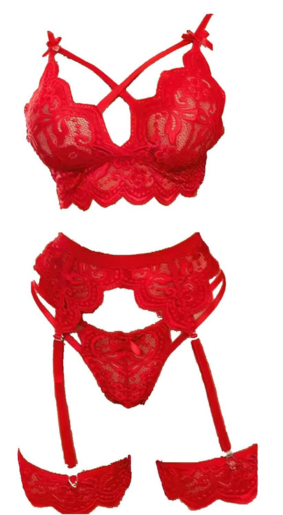 نوع: ست لباس زیر گیپور ۵ تکه (سوتین، بیکینی، گارتر بنددار، جوراب گیپوری، بندهای تزئینی سینه)