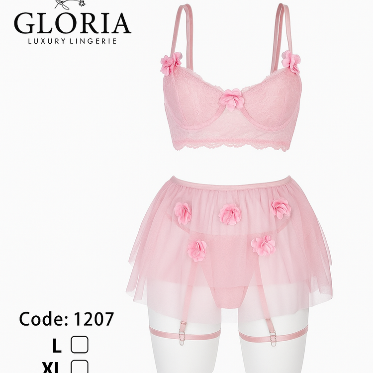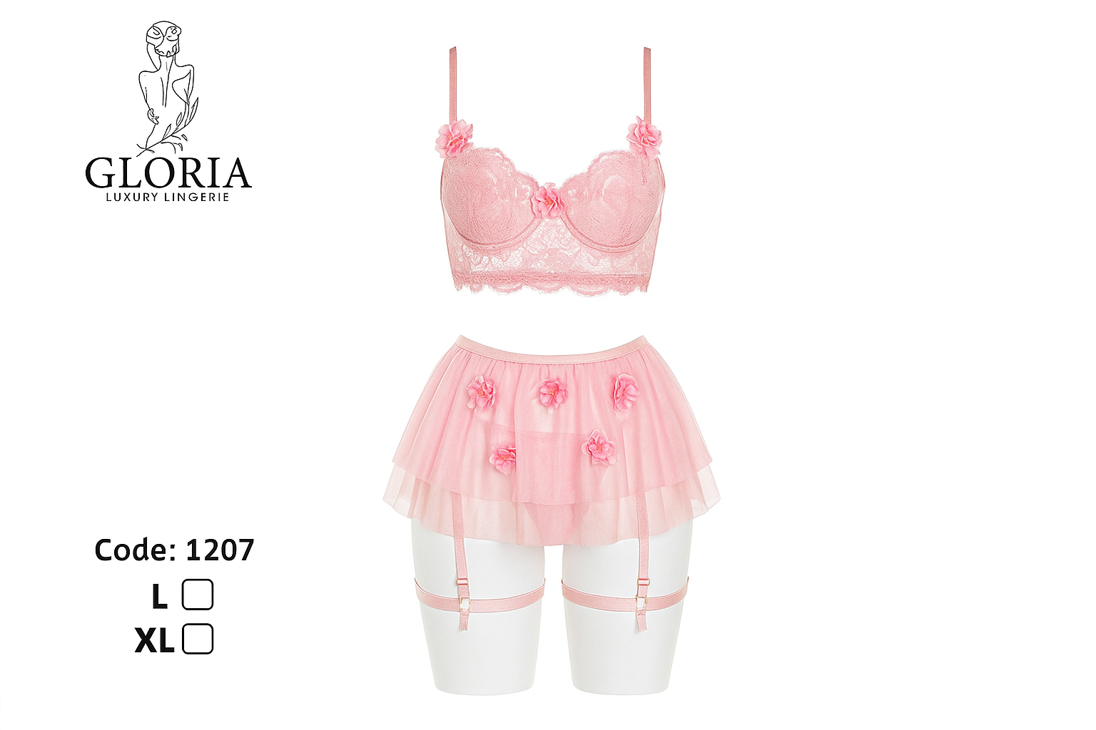 ست صورتی کد 1207 از گلوریا، انتخابی است که بیشتر برای بانوانی مناسب است که به دنبال تجربه حس لطافت همراه با ظرافت طراحی هستند. نکته مثبت مهم این محصول استفاده از تور سبک و دانتل نرم است که اجازه حرکت و تنفس پوستی را فراهم میکند. گلهای سهبعدی روی هر دو بخش سوتین و دامن، هویت خاص و منحصر به فردی به ست میبخشند.