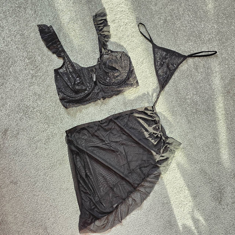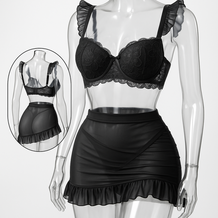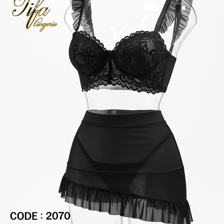 مدل Tifa 2070 برای کسانی طراحی شده که میخواهند بین لباس خواب و یک استایل فانتزی شبانه پلی بزنند. استفاده از گیپور مشکی با بافت برجسته حس لوکس بودن را منتقل میکند، در حالی که دامن کوتاه و چیندار باعث ایجاد تحرک و بازی نور در حرکت میشود.