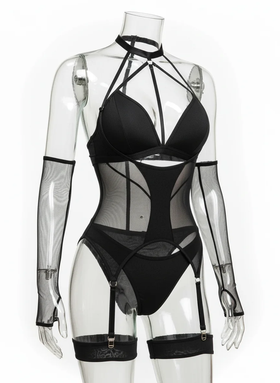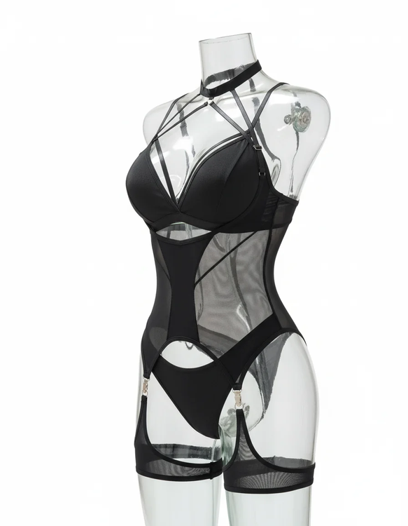 ست لباس زیر زنانه فانتزی با طراحی Body Harness و گیرههای جوراب