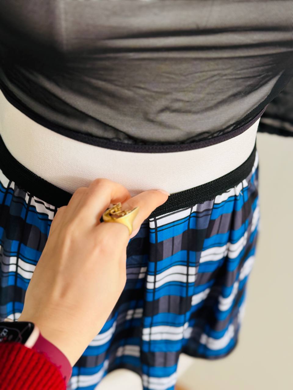 دامن : دامن کوتاه پلیسه با طرح چهارخانه آبی، مشکی و سفید