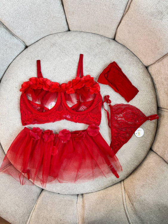 دانتل گلدار فانتزی بندهای کناری ساتنی و طرح بندی V کاملاً هماهنگ با سوتین و گارتر